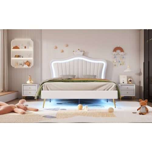 Product Name:Kinderbett Polsterbett 140 x 200 cm, Bettgestell für Mädchen, weißes Kronen-Doppelbettgestell aus PU-Leder mit LED-Leuchten, Lattenrost und Rückenlehne(Matratze nicht enthaltet)