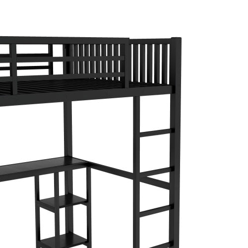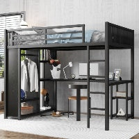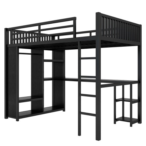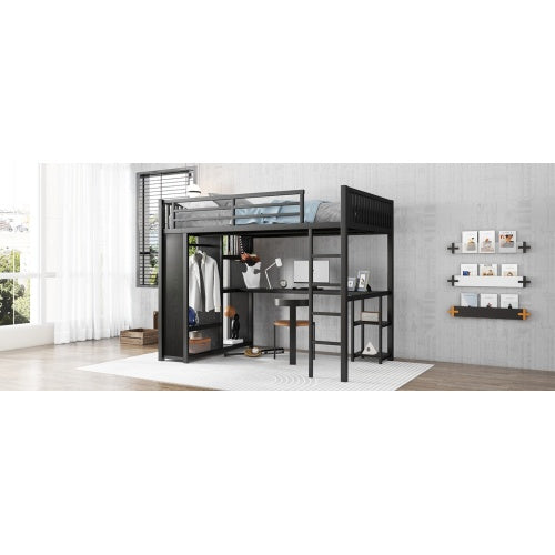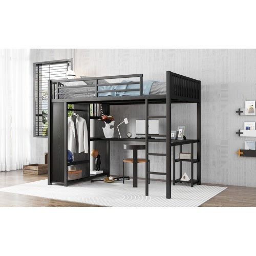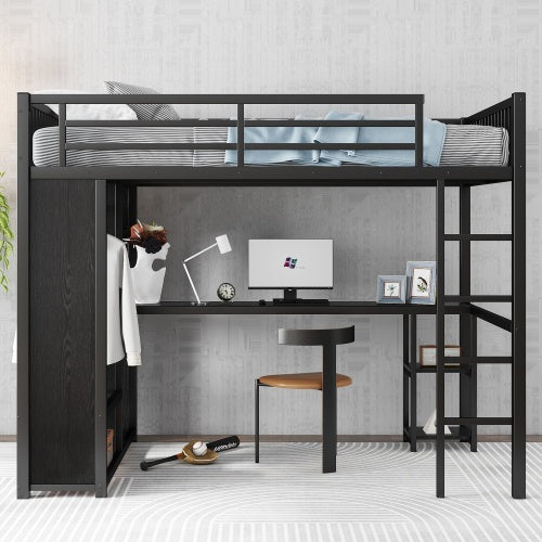 • Full XL Size Loft Bed Frame With Built-in Wardrobe, Metal Loft Bed With Desk And Storage Shelves, Black