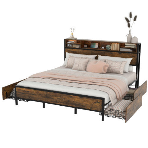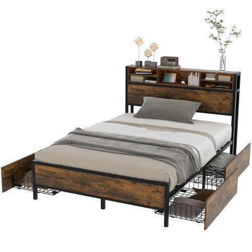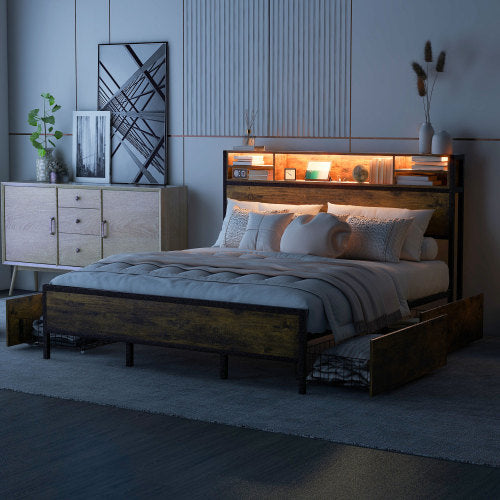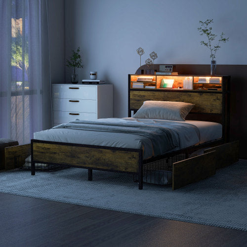 Product Name:180*200cm Flachbett mit Lattenrost und Kopfteil, LED-Bett mit USB-Ladeanschluss, Juniorbett mit 4 Schubladen für Erwachsene und Junioren, Staufunktion, Metall, Braun