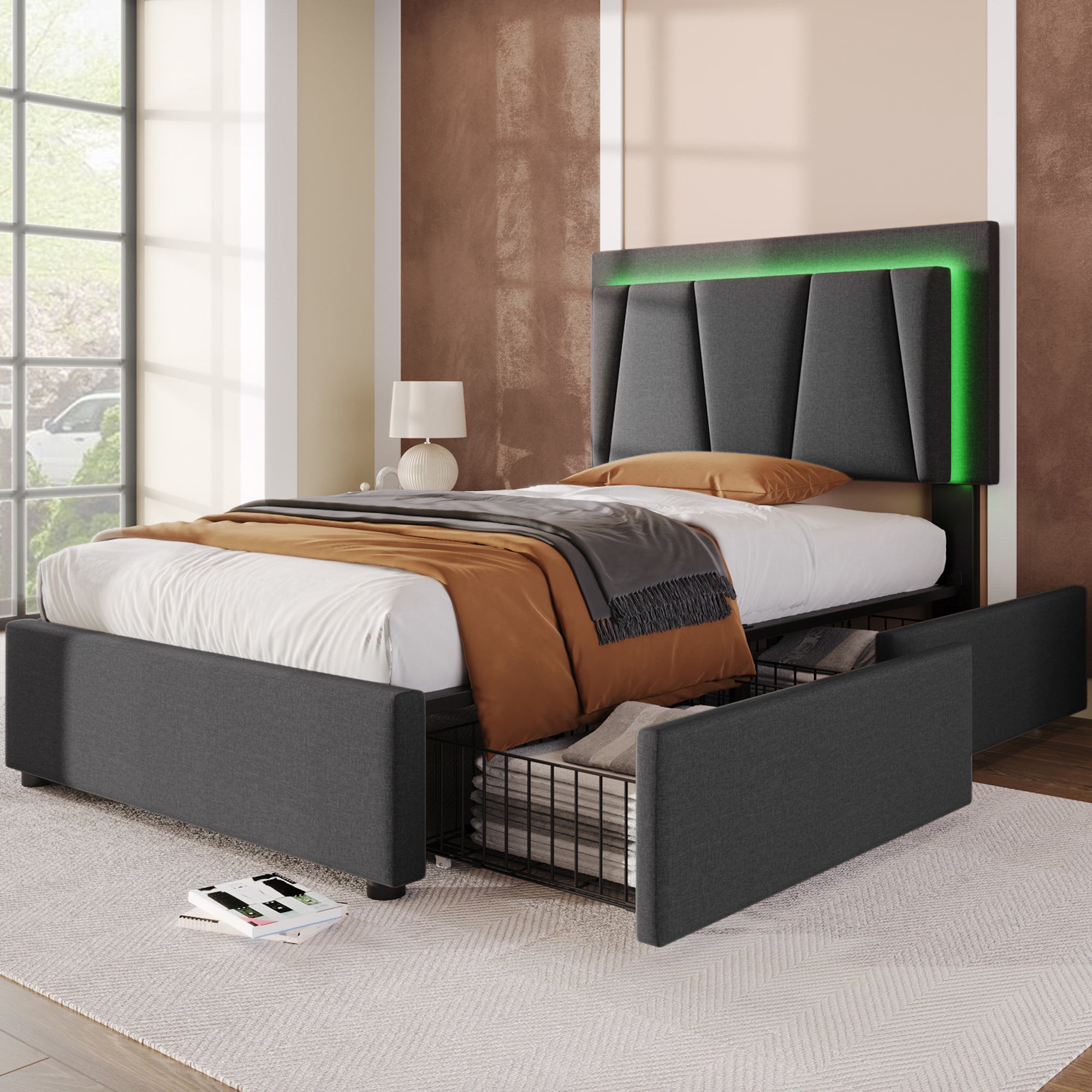 Product Name:Polsterbett mit LED-Beleuchtung und 2 Schubladen,Höhenverstellbarem Kopfteil,Einzelbett 90x200cm Stauraumbetten Bettgestell, Lattenrost aus Holz,Garu (Ohne Matratze)
