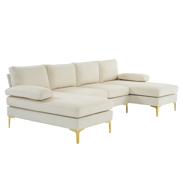 Are you looking for a comfortable sofa for your family? If so,this FCH 280*130*85 U-Shaped 4-Seat Linen Seat Frame Wooden Frame Back Iron Frame Golden Feet Indoor Modular is highly recommended to you. This modern sofa can provide ample seating when guests are over, and easy to lay down on for a nap. The cushions you sit on are nice and firm. You'll never have to worry about sinking in. The more you sit in it the better. So what are you waiting for? Don't hesitate, it's worth buying!