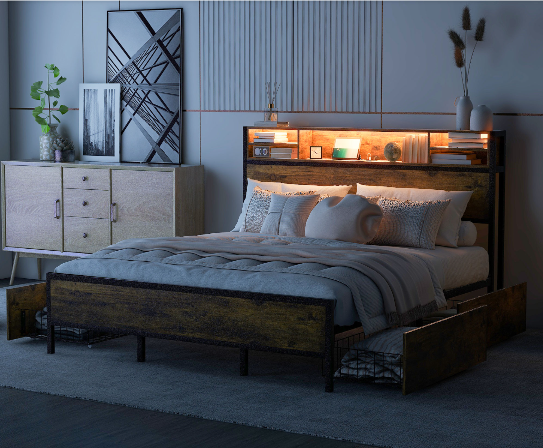 Product Name:180*200cm Flachbett mit Lattenrost und Kopfteil, LED-Bett mit USB-Ladeanschluss, Juniorbett mit 4 Schubladen für Erwachsene und Junioren, Staufunktion, Metall, Braun