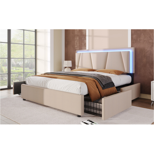 Product Name:Polsterbett mit LED-Beleuchtung und 4 Schubladen,Höhenverstellbarem Kopfteil,Doppelbett 140x200cm Stauraumbetten Bettgestell, Lattenrost aus Holz, Beige (Mit Matratze)