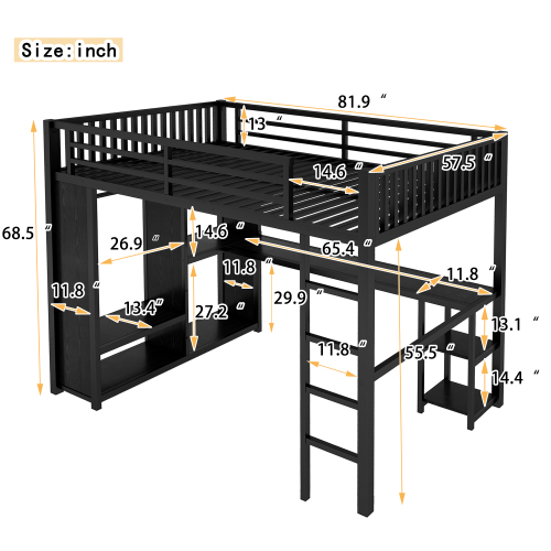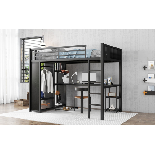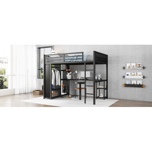 Product Name:Full XL Size Loft Bed Frame with Built-in Wardrobe, Metal Loft Bed with Desk and Storage Shelves, Black