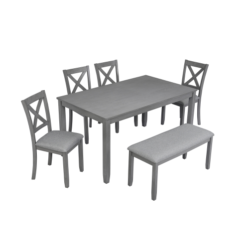Product Name:6 Piece Kitchen Dining Set, Rectangular Wooden Dining Table with 4 Upholstered Chairs and a Bench, Dining Table Set for 6 People, Living Room, Home Bar and Kitchen, Gray