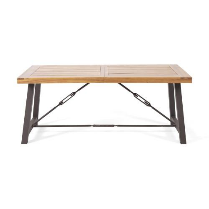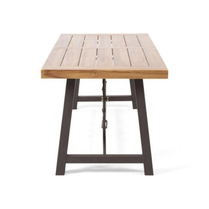 - MODERN INDUSTRIAL: Our dining table incorporates a powder-coated frame with sleek wooden slats to create an understated modern industrial design.Featuring smooth metal contrasted by natural wood, this table offers a chic aesthetic to any home.ACACIA WOOD: Made with acacia wood that brings a sleek and exotic look to your space, this durable hardwood naturally withstands outdoor elements and will not darken over time.Acacia wood is perfect as a solid, heavy frame that resists wear and tear.