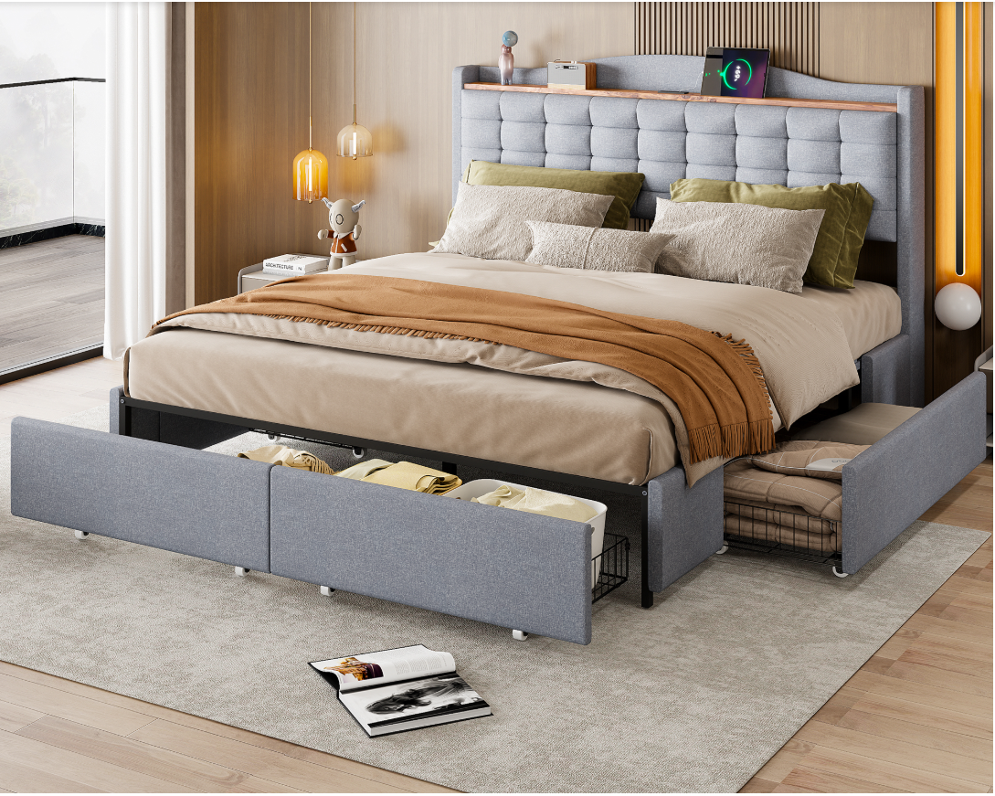 Product Name:Polsterbett 160*200 cm, Nachttisch mit USB-Ladeanschluss und Ablage, Doppelflachbett mit 4 Schubladen, Leinenstoff Grau