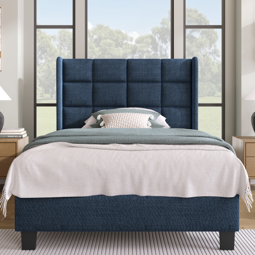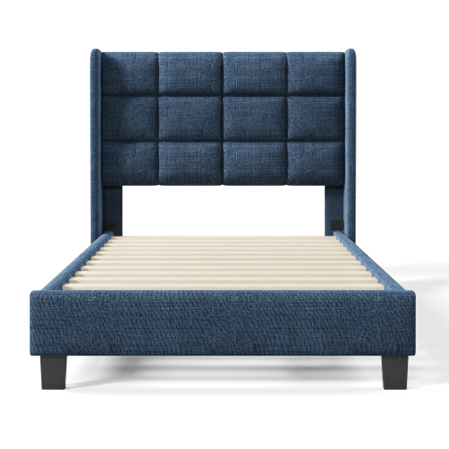 Product Name:Modernes Design Polsterbett Mit seinem gepolstertes Kopfteil Einzelbett mit Lattenrost, 90x200cm ,in Blau Leinen, mittelfest (Ohne Matratze)