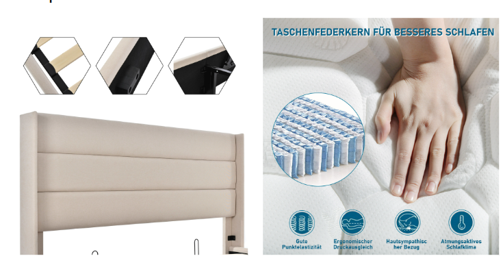 - Hydraulikstange-Toller Stauraum: Großer Bettkasten unterhalb des hochklappbaren Lattenrosts mit viel Stauraum für die Aufbewahrung von Decken, Kissen oder Bettwäsche, Lattenrost durch Hubzylinder leicht hochklappbar.