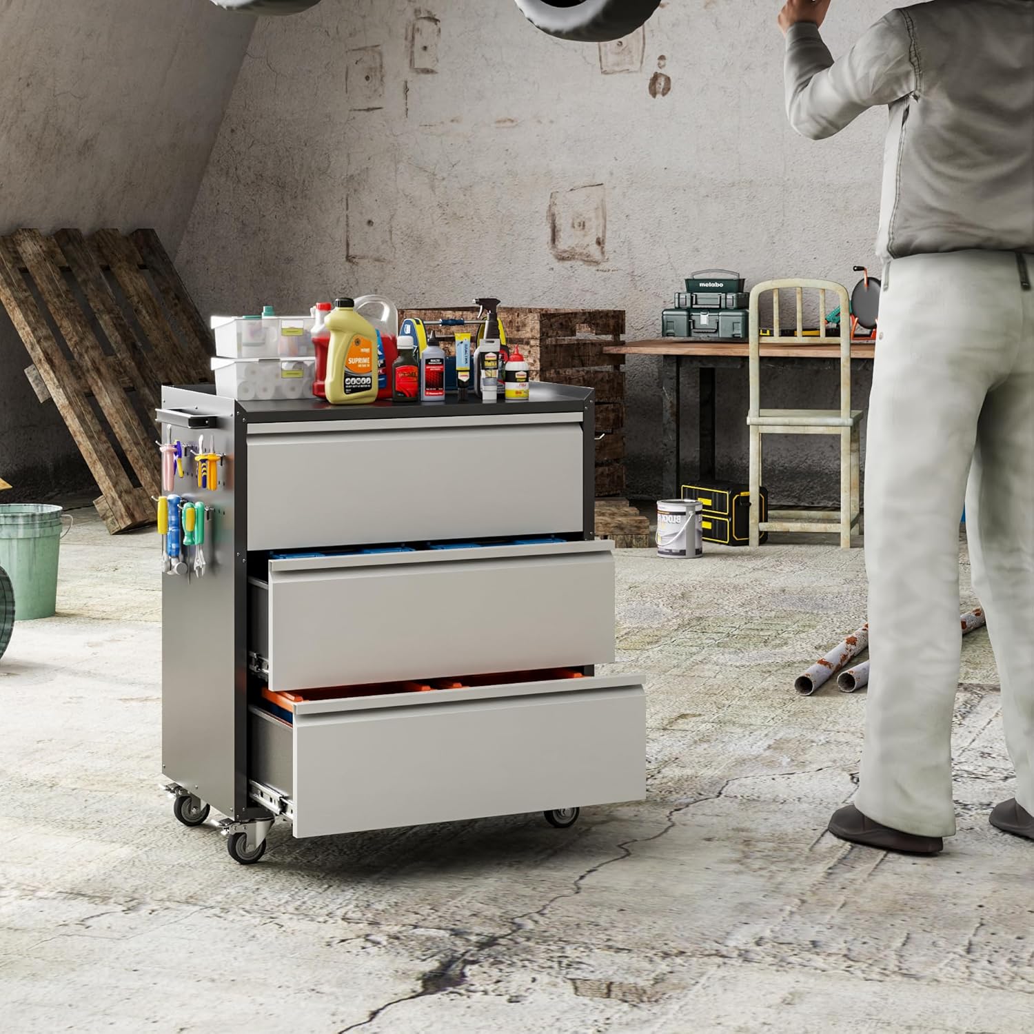 • Aobabo Tool Storage Garage Cabinet With Wheels, 3 Drawer Tool Chest Rolling Metal Storage Cabinet On Wheels, Assembly Required, Black Gray
